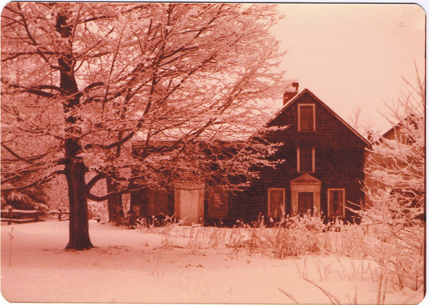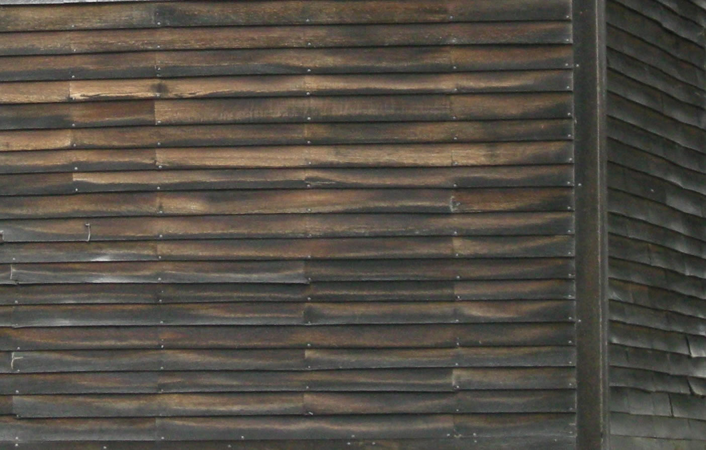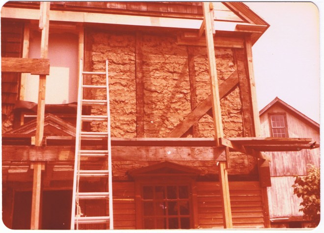 We then dipped, or soaked, the first batch of shorter lengths in a big barrel of the witches brew we had learned about at the Hempsted house.  We affixed the short, scarfed, clapboards at the back of the lean-to and new bathroom section first.  This ultimately would be the only section on which we used the “brew.”  It would be two years before we got to siding the rest of the house, and by then, the “forbidden” product – creosote – the main ingredient of the “brew” was no longer available.  So, the rest of the house was simply coated with boiled linseed oil, a task we’ve neglected to re-do much over the years.  Somehow, these clapboards have weathered the time and neglect amazingly well, and aged a most beautiful pumpkin, tobacco, and other dark shades of pine in spite of us.  The back side, however, still retains that original charcoal color.