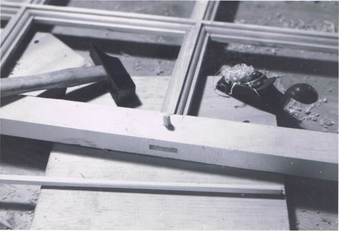 With just a putty knife and an occasional coaxing with a utility blade, the old putty was scraped out and into a pile beneath my sawhorses.  I cleaned the glass, installed new points where needed, oiled the beds with a mix of linseed and turp, and began to re-glaze.