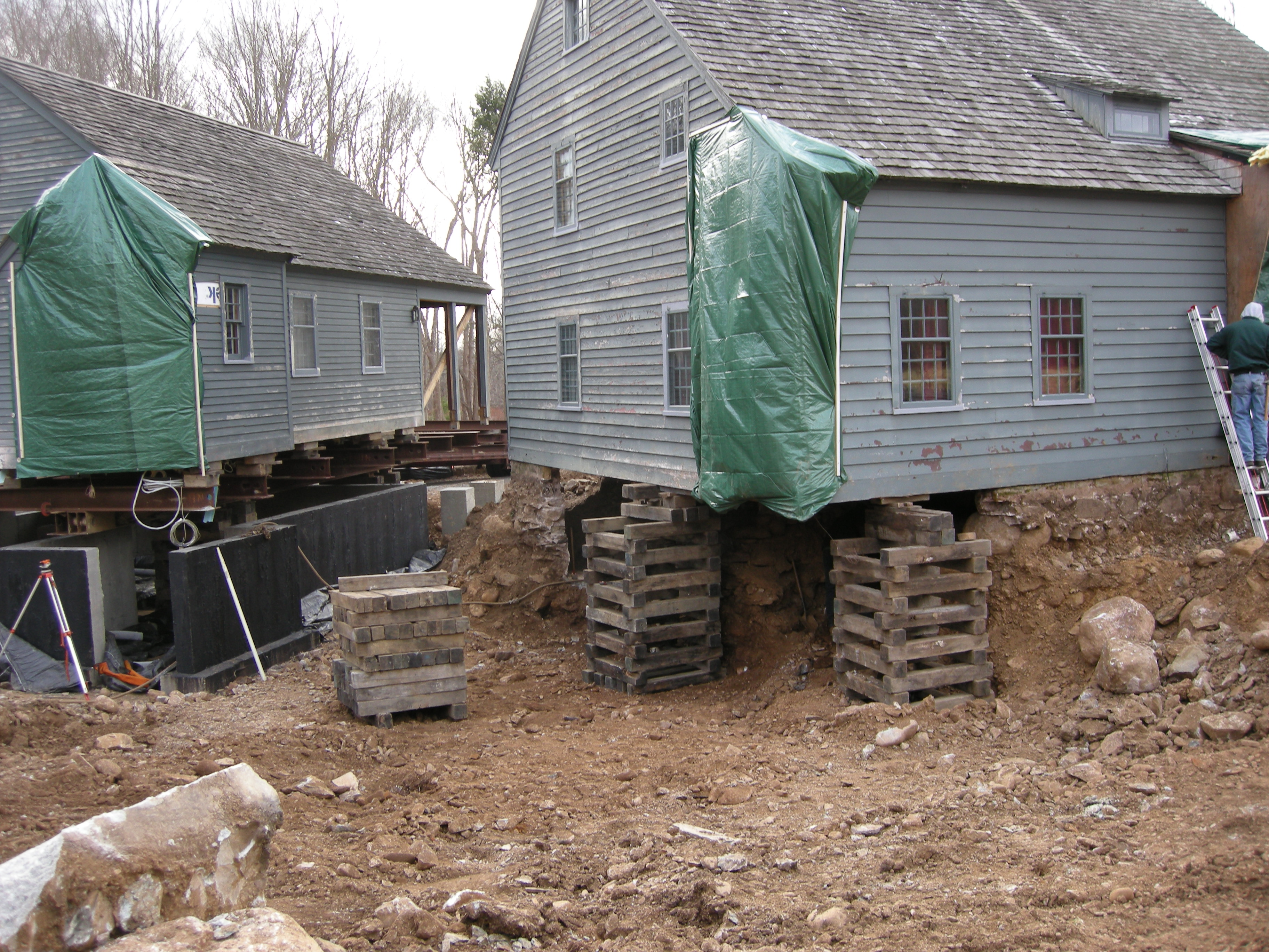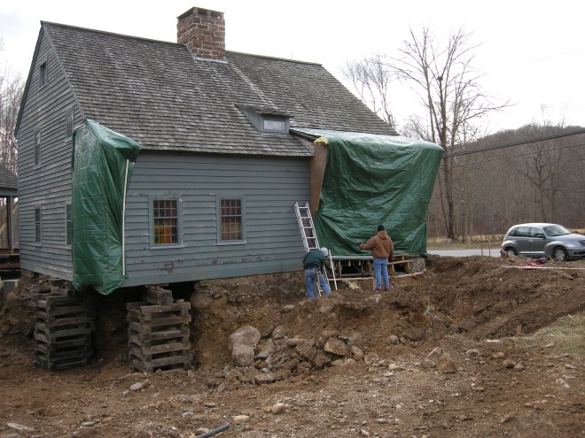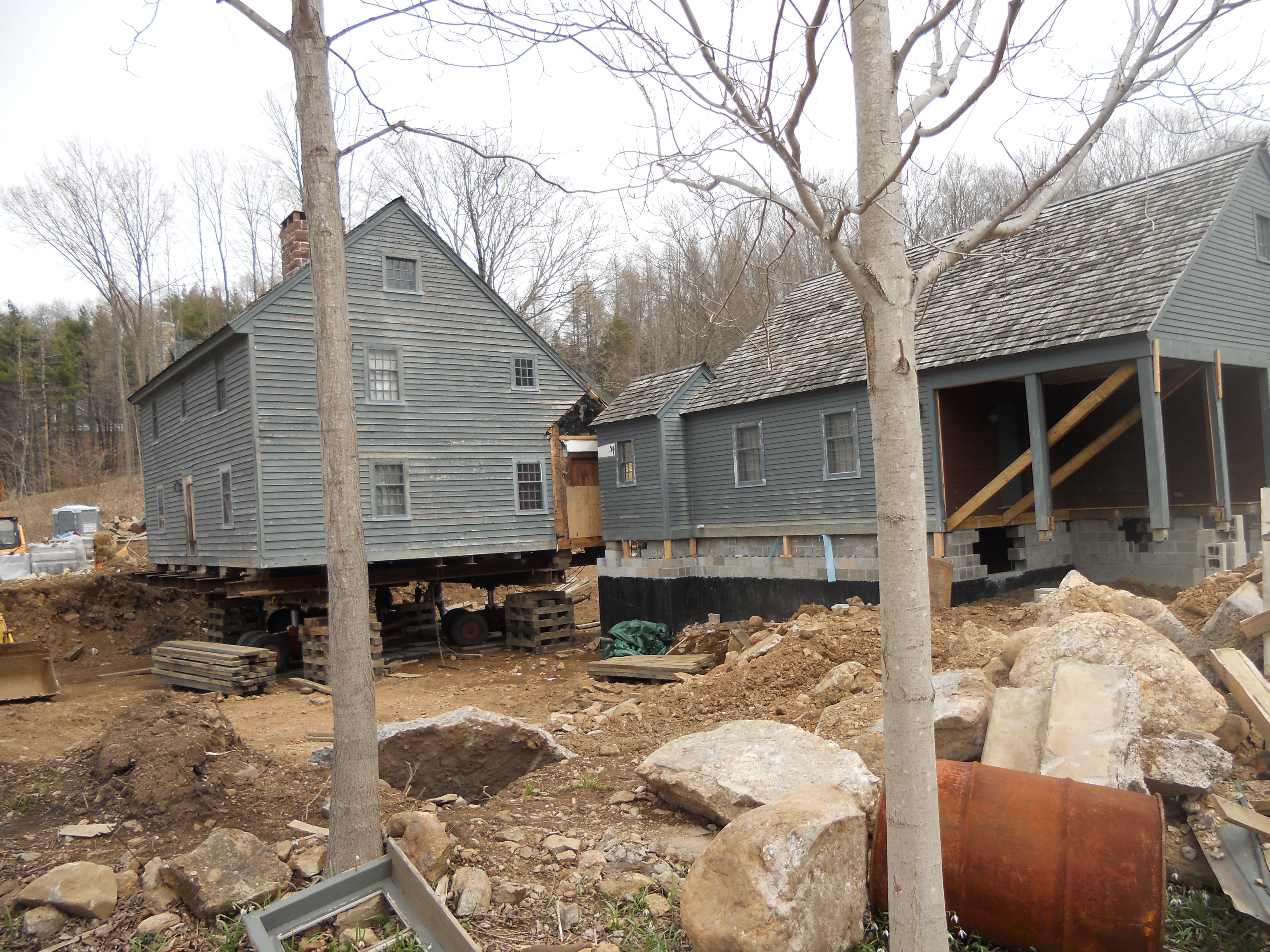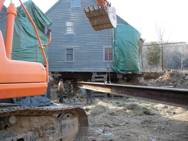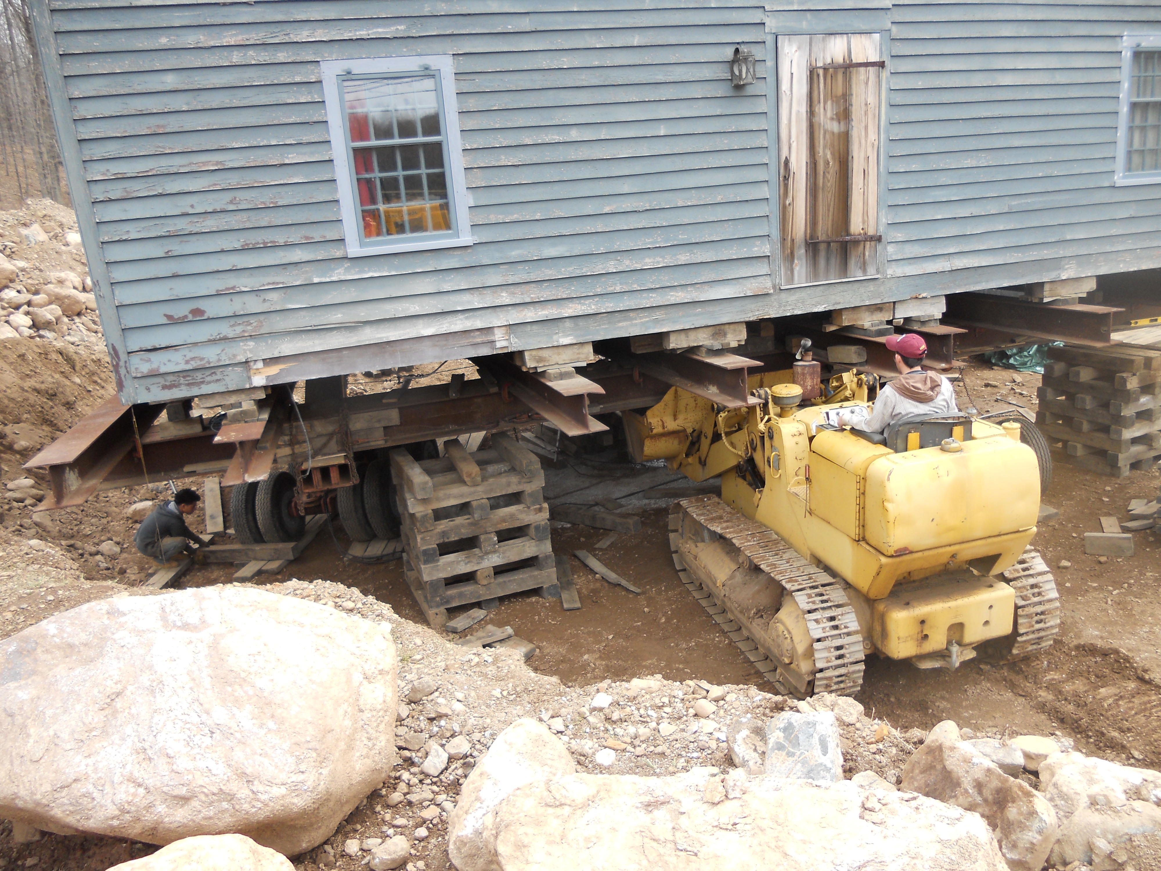 In the old days I suppose a team of oxen and a dozen hardy men tackled the task.  These days we have trucks and tractors and bulldozers, steel beams and pneumatic equipment to help a few hardy men.  Here are some photos of the process, in case you might be considering such a move, and want to know a bit of what it takes.  First this house had to be moved in two sections, so they were separated, secured, and weather protected.  The foundation, old stone and dirt, had to be dug away, jackhammered, excavated; the sills, framing and chimney supported; tracking excavated and created to roll the house sections to their new site, which of course had to be dug out for a new basement and foundation, creating a new, usable basement which is every old house owners dream.  Well, most.