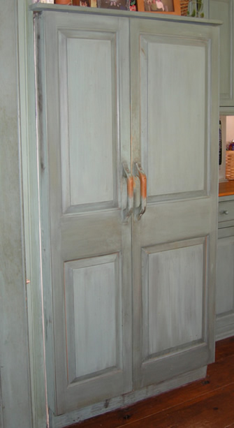 Bring as much of the fabric of the original house – materials and design – into your kitchen. If your house is early with raised panel doors, beams in the ceiling, wainscoting on the walls – bring it in! Use similar color finishes, plaster the walls, or add texture to the paint. Use natural surfaces for counters – wood or soapstone. Build in the fridge, and cover it. Cover the dishwasher to match. But whatever you do, don’t bring preconceived notions from the last house, especially if it was a condo or builder’s colonial, or from a magazine on “new” kitchens, to the antique house. You don’t have to have double ovens, and please don’t put a microwave above the stove or cook top. Finishes don’t have to be “sprayed” on, joints don’t have to be blended to oblivion – it should look hand made for heaven’s sake! When production cabinetry adjoins a hand crafted antique room, the contrast is evident and the result is sterile.