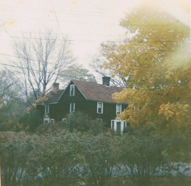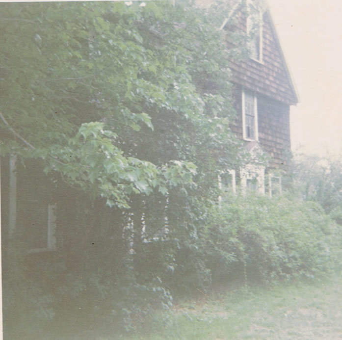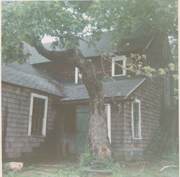 On the left you see the backside of that wall that divided up the room – and the bit of fireplace mantel showing! Imagine building a wall right into the decorative mantel?! Note the featherboarding covered with wallpaper – and the gunstock post to the right. Through the hallway you can see the “apartment” they created in the other front room. This room also was divided, painted six different colors, and a crude kitchen added. Here’s an old polaroid I found.